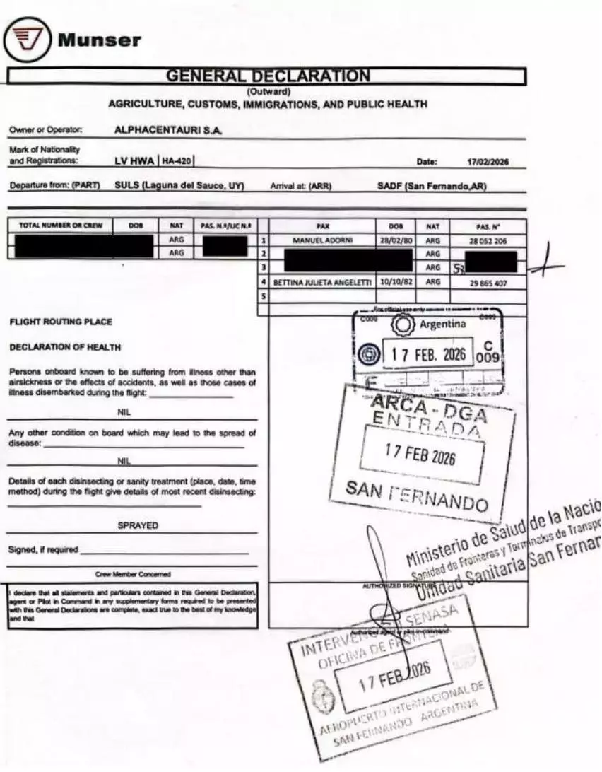 Declaración jurada de regreso desde el aeropuerto de Laguna del Sauce, en Punta del Este, a San Fernando, el 17 de febrero de 2026. El cambio de nombre del operador se debe a que el regreso se registró vía una empresa uruguaya.