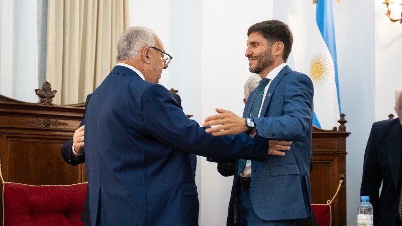 . Gutiérrez es saludado por el gobernador Pullaro luego del discurso (Prensa Poder Judicial)